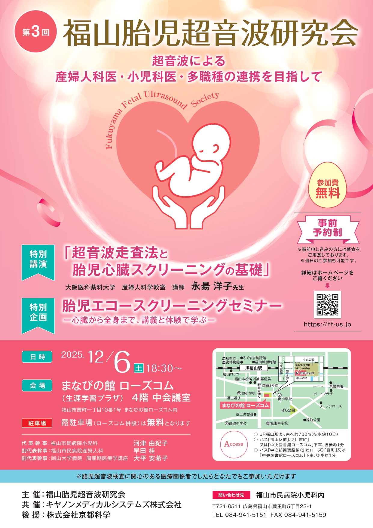 日程:2025年6月28日(土)/19:00~会場:まなびの館ローズコム(福山市生涯学習プラザ)4階 中会議室参加費:無料(事前予約制)開催形式:現地開催のみとなります※胎児超音波検査に関心のある医療関係者でしたらどなたでもご参加いただけます プログ […]